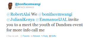 So we went to Dandora and had a great time. People were talking how they can change the country and how we should ignore the current leadership. It was a civic initiative and was suppose to be political. I suspected something was wrong when Vision 2030 kept being shoved down our throats. Then I asked Boniface and the MC, Mwaseki, if the event was being used to market Vision 2030 because I have serious issues with the Vision. I later asked others when we were leaving the event venue if the trip was sponsored by Vision 2030. Some guy was non-commital but he suspected it was. But I still gave it benefit of doubt. Vision 2030 is a political document and you cannot market a political document in the same meeting where you are talking of changing the status quo.
