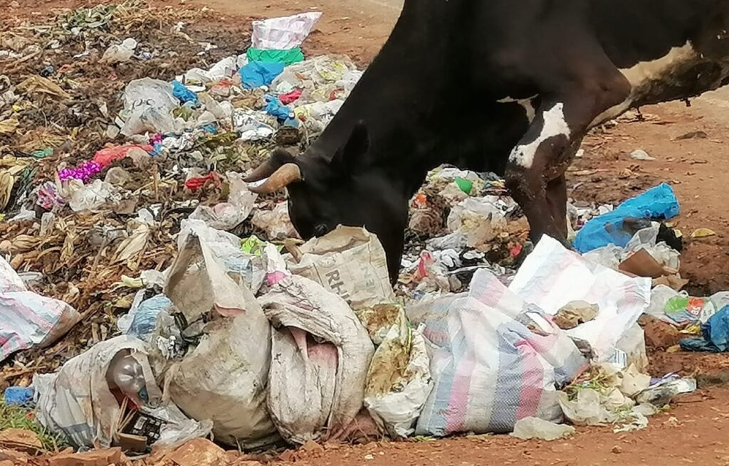 In some swelling heaps, cows and goats from the neighborhood villages leisurely munch the food remains dumped there.