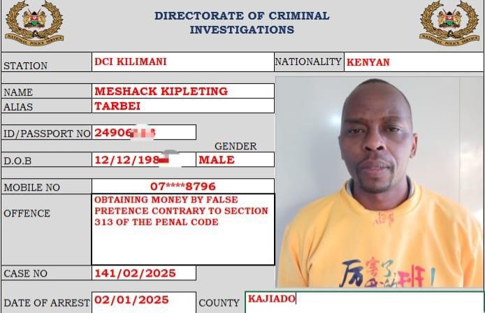 Detectives drawn from DCI Kilimani arrested one Meshack Kipleting Tarbei – a serial fraudster and Director of Motorshop E.A Ltd who has been hiding for over a year after fleecing unsuspecting members of the public their hard-earned money.