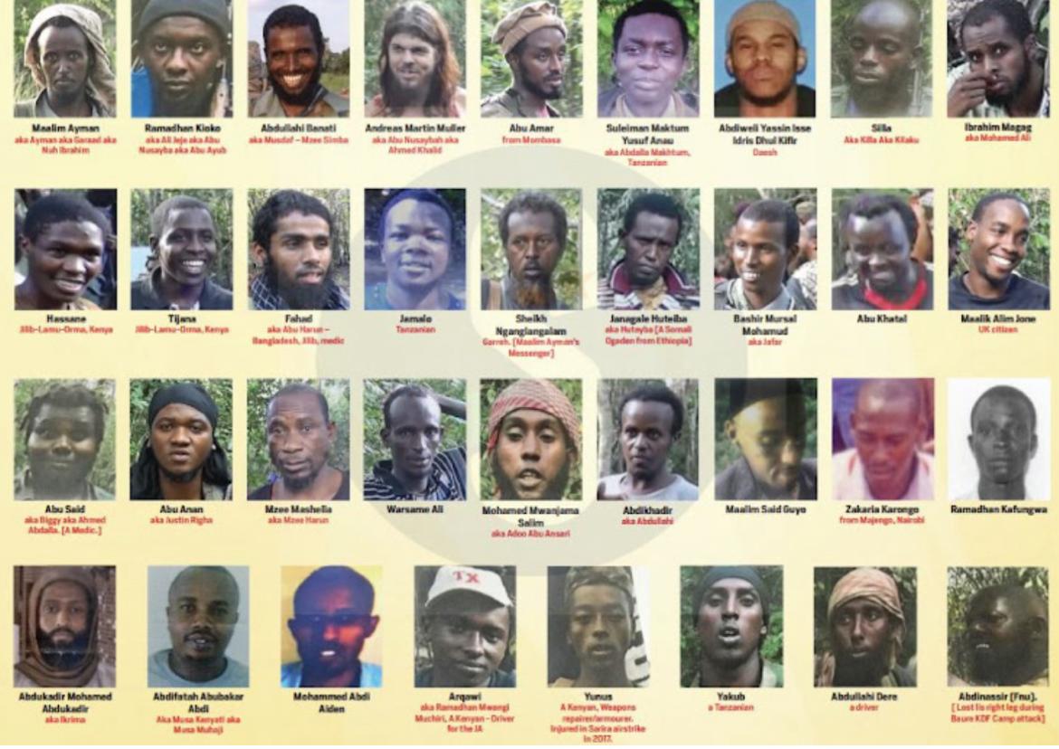 The names are Maalim Ayman, Ramadhan Kioko, Abdullahi Banati, Andreas Martin Muller, Abu Amar, Suleiman Maktum, Yusuf Anau a Tanzanian national, Abdiweli Yassin Isse, Idris Dhul Kifir, Silla, Ibrahim Magag, HassaneTijana and Fahad a Bangladeshi national who is also a medic(Bangladesh-Medic). Others on the wanted list are Tanzanian national Jamalo, Sheikh Nganglangalam, a messenger, Ethiopian national Janagale Huteiba, Bashir Mursal Mohamud, Abu Khatal, Maalik Alim Jone from the United Kingdom, Abu Said (a medic), Abu Anan, Mzee Mashella, Warsame Ali, Mohamed Mwanjama Salim and Abdikhadir.